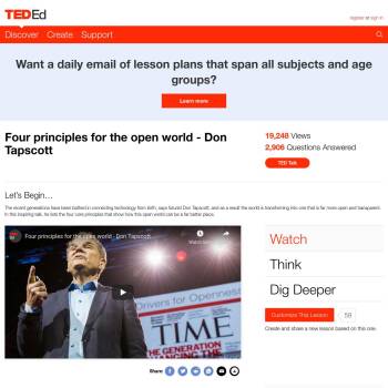 TED-Ed Lesson: The recent generations have been bathed in connecting technology from birth, says futurist Don Tapscott, and as a result the world is transforming into one that is far more open and transparent. In this inspiring talk, he lists the four core principles that show how this open world c…