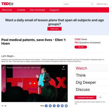 TED-Ed Lesson: Patenting a new drug helps finance its immense cost to develop -- but that same patent can put advanced treatments out of reach for sick people in developing nations, at deadly cost. Ellen ’t Hoen talks about an elegant, working solution to the problem: the Medicines Patent Pool. …