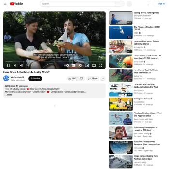 How does a sailboat work? The standard idea is that the wind pushes the sails from behind, causing the boat to move forward. Although this technique is used at times, it is not the most efficient way to sail a boat (and it means the boat can never go faster than the wind). Lift is the key mechanism driving a boat forwards. As air flows over the sails, it moves faster over the outer side, creating lower pressure than on the inner side. This produces a force which is mostly to the side and a bit forwards. Lift on the centerboard pushes to the opposite side, cancelling the sideways force and adding a forward component of force to the boat.