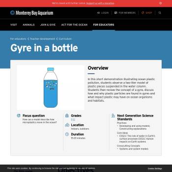 In this short demonstration illustrating ocean plastic pollution, students observe a two-liter model of plastic pieces suspended in the water column. Students then review the concept of a gyre, discuss how and why plastic particles are found in gyres and what impact plastic may have on ocean organisms and habitats.