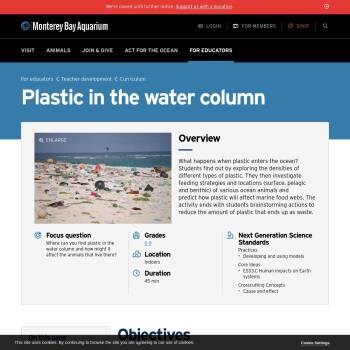 What happens when plastic enters the ocean? Students find out by exploring the densities of different types of plastic. They then investigate feeding strategies and locations (surface, pelagic and benthic) of various ocean animals and predict how plastic will affect marine food webs. The activity ends with students brainstorming actions to reduce the amount of plastic that ends up as waste.