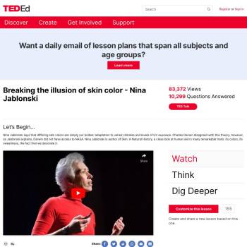 TED-Ed Lesson: Nina Jablonski says that differing skin colors are simply our bodies’ adaptation to varied climates and levels of UV exposure. Charles Darwin disagreed with this theory, however, as Jablonski explains, Darwin did not have access to NASA. Nina Jablonski is author of Skin: A Natural Hi…