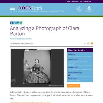 In this activity, students will answer questions to help them analyze a photograph of Clara Barton. They will also compare this photograph with their expectations of what a nurse looks like.