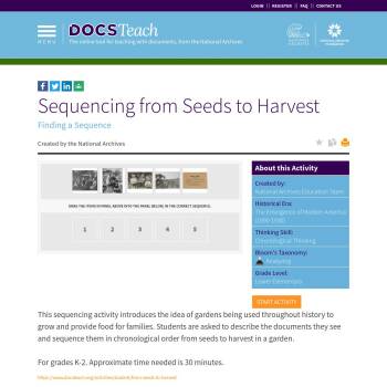 This sequencing activity introduces the idea of gardens being used throughout history to grow and provide food for families. Students are asked to describe the documents they see and sequence them in chronological order from seeds to harvest in a garden.
