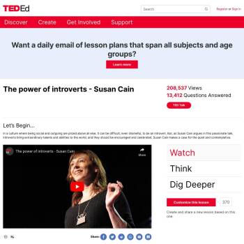 TED-Ed Lesson: In a culture where being social and outgoing are prized above all else, it can be difficult, even shameful, to be an introvert. But, as Susan Cain argues in this passionate talk, introverts bring extraordinary talents and abilities to the world, and they should be encouraged and celeā¦